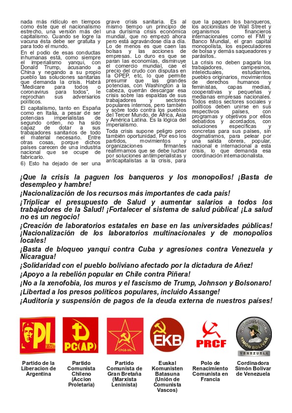 Los partidos, movimientos y organizaciones abajo firmantes nos dirigimos a nuestros trabajadores y pueblos a propósito de la pandemia de coronavirus. Hacemos un llamado solidario a combatirla, pero también denunciamos a fondo el sistema social injusto capitalista e imperialista que permitió su aparición y expansión.